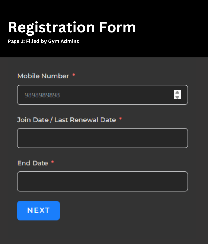 The first section of the form is reserved for Gym Admins. It’s designed for quick entry of essential gym membership details like Member’s mobile number, Join date or last renewal date, Membership expiration date. This lets the backend start validating the Membership Status, send upcoming renewal alerts, and segment active vs inactive members effortlessly. Admins can update this anytime from their dashboard.