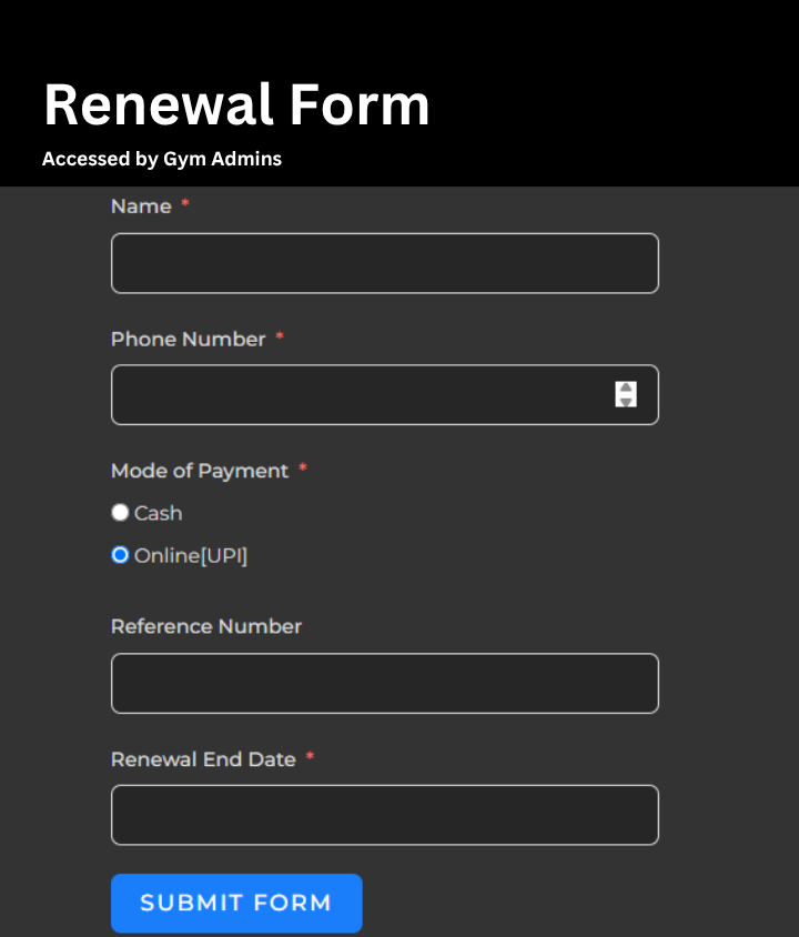 Renewals are easier than ever with our dedicated Gym Membership Renewal Form, available only to authorized Gym Admins. This form ensures every membership is accurately updated with verified details helping you maintain clean records and provide timely service to your members.