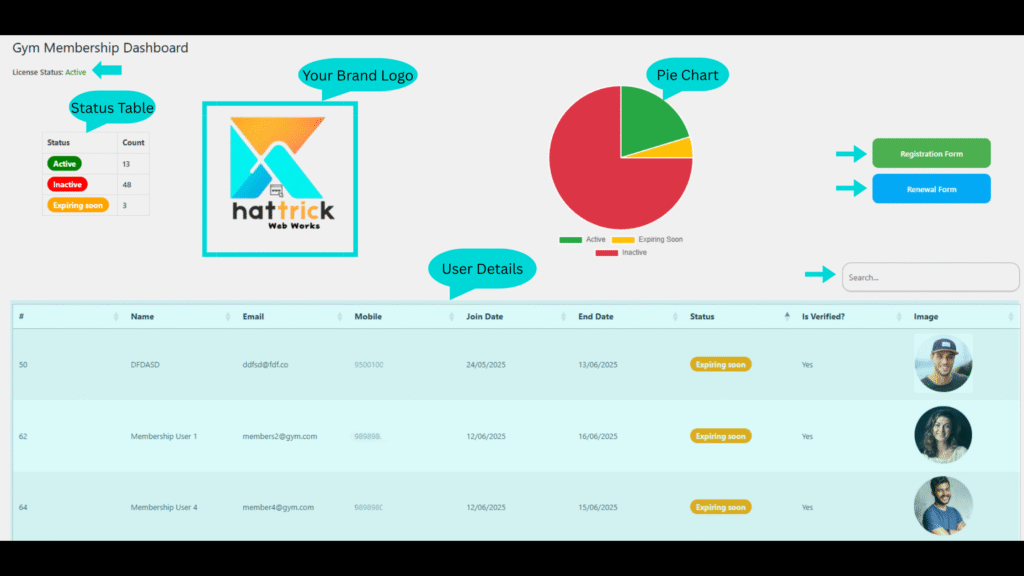 At the top, get a visual snapshot of your membership health with a smart status pie chart that shows Active Members, Expiring Soon, Inactive Members You can instantly see where attention is needed whether it’s following up with expiring users or bringing inactive members back into your gym family. A quick status summary box shows total counts for each status, helping you stay on top of renewals and re activations.